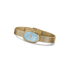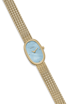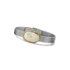 The Jane Tethered Mini Watch celebrates the bonds that tie us together. This petite timepiece features an 18mm oval case paired with a champagne mother of pearl dial that catches the light beautifully. The woven mesh bracelet includes a convenient quick release clasp for easy on-and-off wear. Each dial is uniquely textured—a natural characteristic of mother of pearl that makes your watch one-of-a-kind. Perfect for everyday wear, it's a subtle reminder of connection and shared moments.