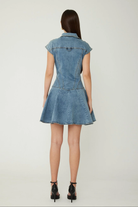 Crafted from JS71's stretch denim in a medium wash, the Tina dress features elegant gold hardware accents. Its fit-and-flare silhouette enhances your shape beautifully. Versatile in style, it transitions effortlessly from casual to refined with just a change of footwear.