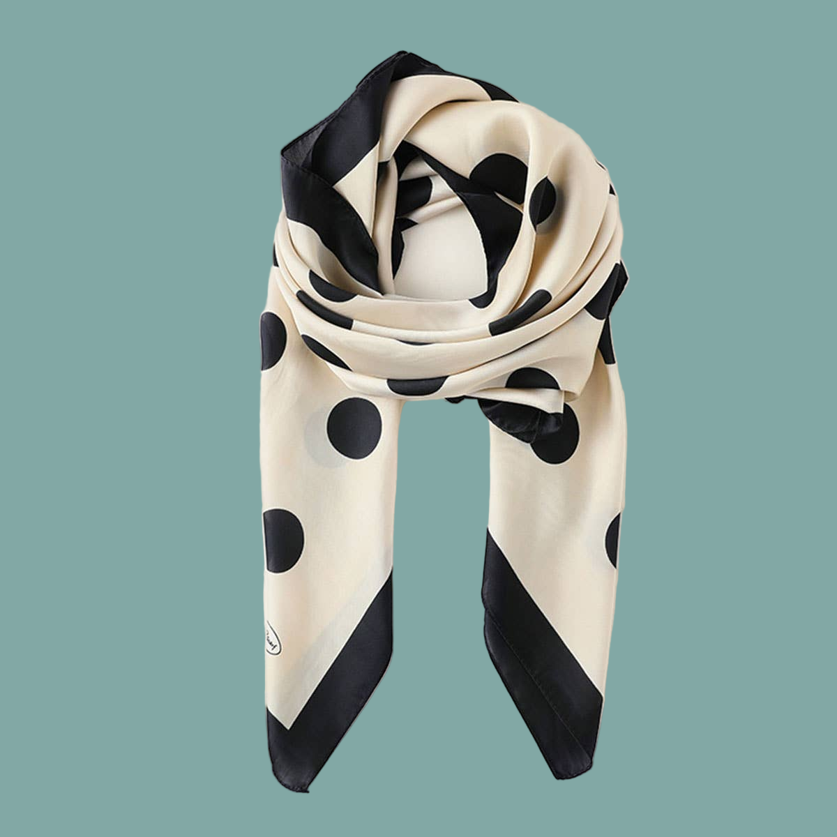 Wrap yourself in timeless style with the Polly Polka Dot Satin Scarf. This oversized accessory features a classic black and cream polka dot pattern on luxurious satin fabric that feels as good as it looks. Perfect for adding a pop of retro charm to any outfit, whether you're dressing up for a night out or keeping it casual. The generous size gives you endless styling options—drape it around your neck, tie it in your hair, or wear it as a chic headscarf. A versatile wardrobe essential that brings effortless elegance to your everyday look.