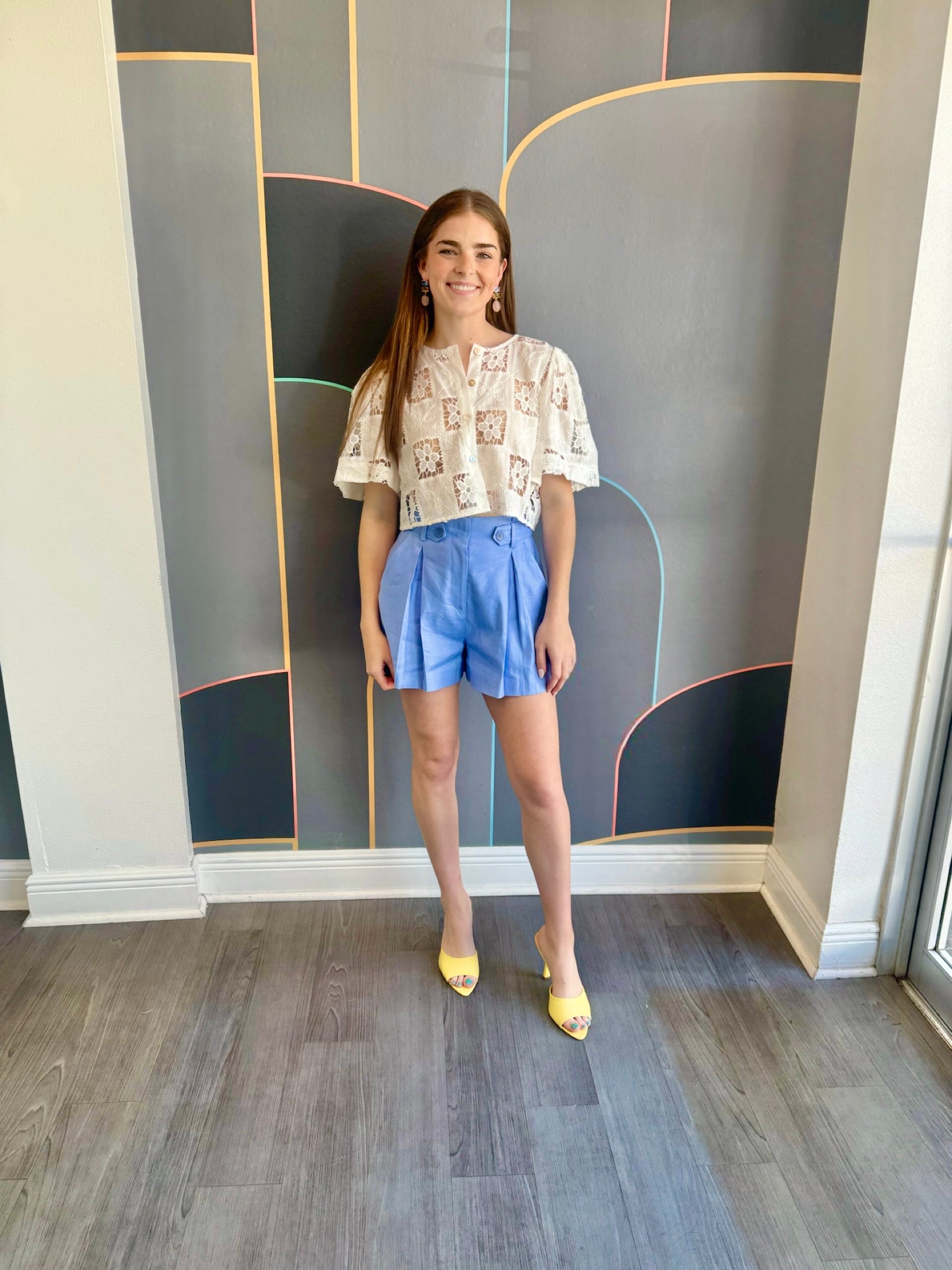 Stay cool and stylish with our Ollie Shorts. Made with a pleated linen blend, these shorts feature functional side pockets and decorative button detail for added flair. The concealed front zipper and hook closure ensure a secure fit, while the dry clean only fabric keeps them looking sharp.