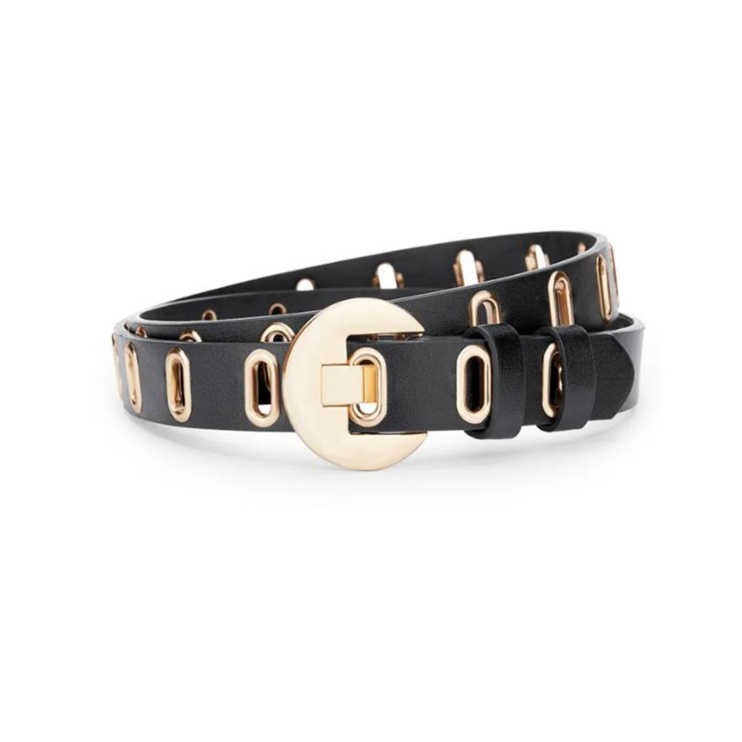 Made from cruelty-free vegan leather, this belt is not only stylish, but also environmentally conscious. The gold plated brass buckle and grommets add a touch of glamour to any outfit. With a length of 42.25" and a width of 1", it's fully adjustable for the perfect fit. Get ready to slay in style!