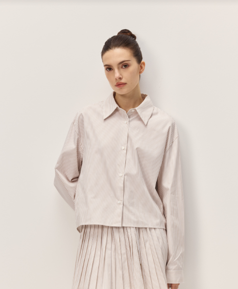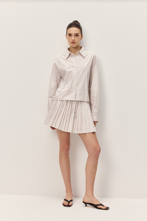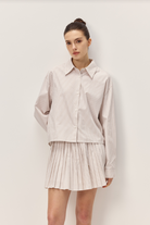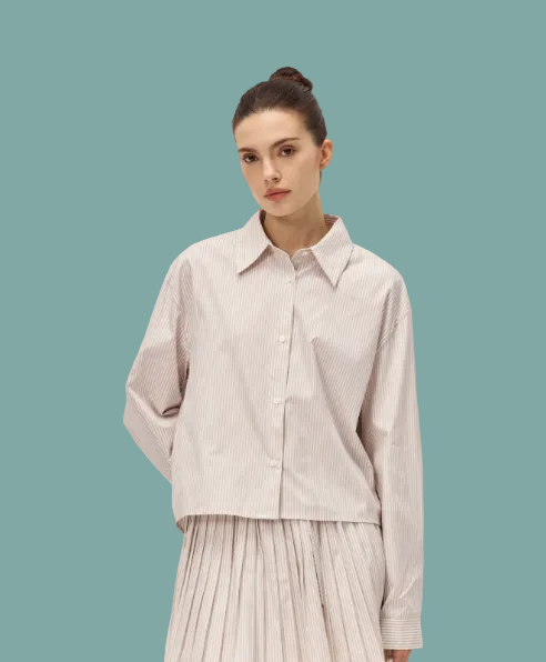 The Danika Shirt combines timeless style with versatile appeal. This collared button-down features a sophisticated taupe and white striped pattern that pairs effortlessly with jeans, trousers, or skirts. The classic design works for casual outings or layered under sweaters for added dimension. Perfect for building a wardrobe of essential pieces that transition seamlessly from season to season.