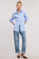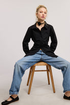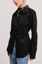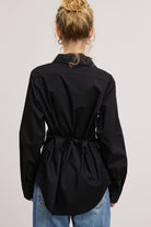 This long-sleeve collared blouse offers a fitted shape with a front button-down design and a unique self-tie ribbon at the back, adding a stylish touch and extra shape.