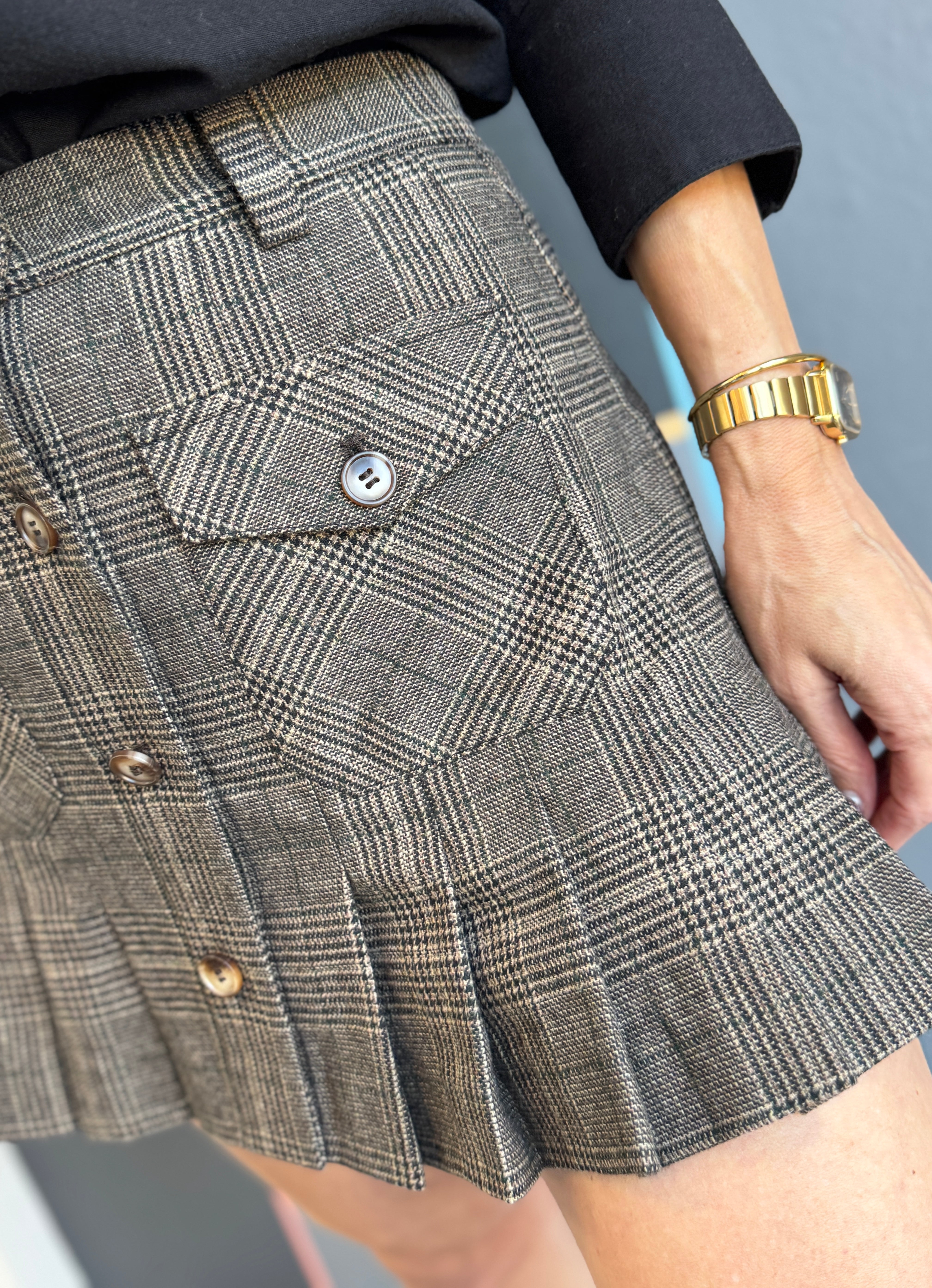 The Clapton Pleat Mini Skirt brings effortless style with its signature front button detail in gleaming gold and flattering pleated design. Dress it down with a simple tee and ankle boots, or layer with tights for cooler days. A versatile piece that transitions seamlessly from casual outings to weekend adventures.