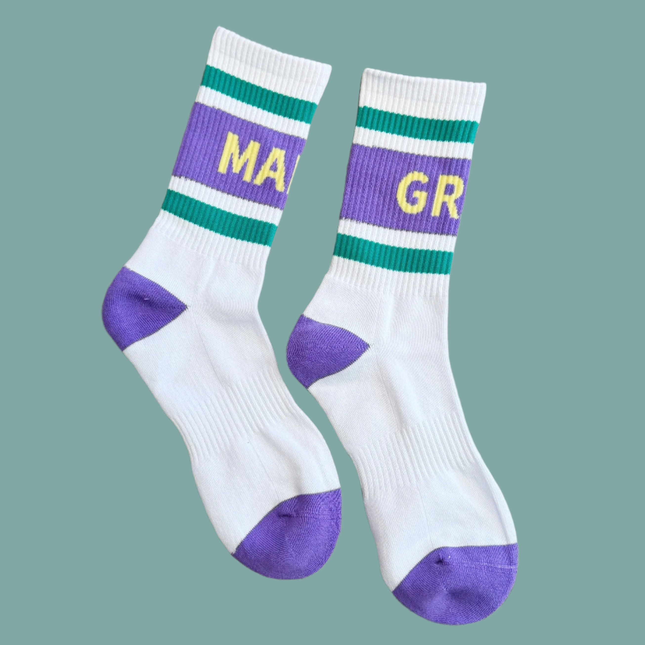 Get ready to party with our Mardi Gras Varsity Socks! These crew socks feature vibrant purple, green, and gold colors, perfect for celebrating. And with their comfortable fit, you'll be dancing all night long. Let the good times roll!
