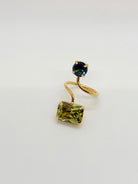 This stunning two-stone ring combines modern elegance with timeless appeal. The sea green circle diamond sits proudly at the top, catching light with brilliant sparkle, while a yellow gold emerald cut stone anchors the design below. The contrasting shapes and complementary hues create a sophisticated yet playful look that works for everyday wear or special occasions. A versatile piece that lets your personal style shine.