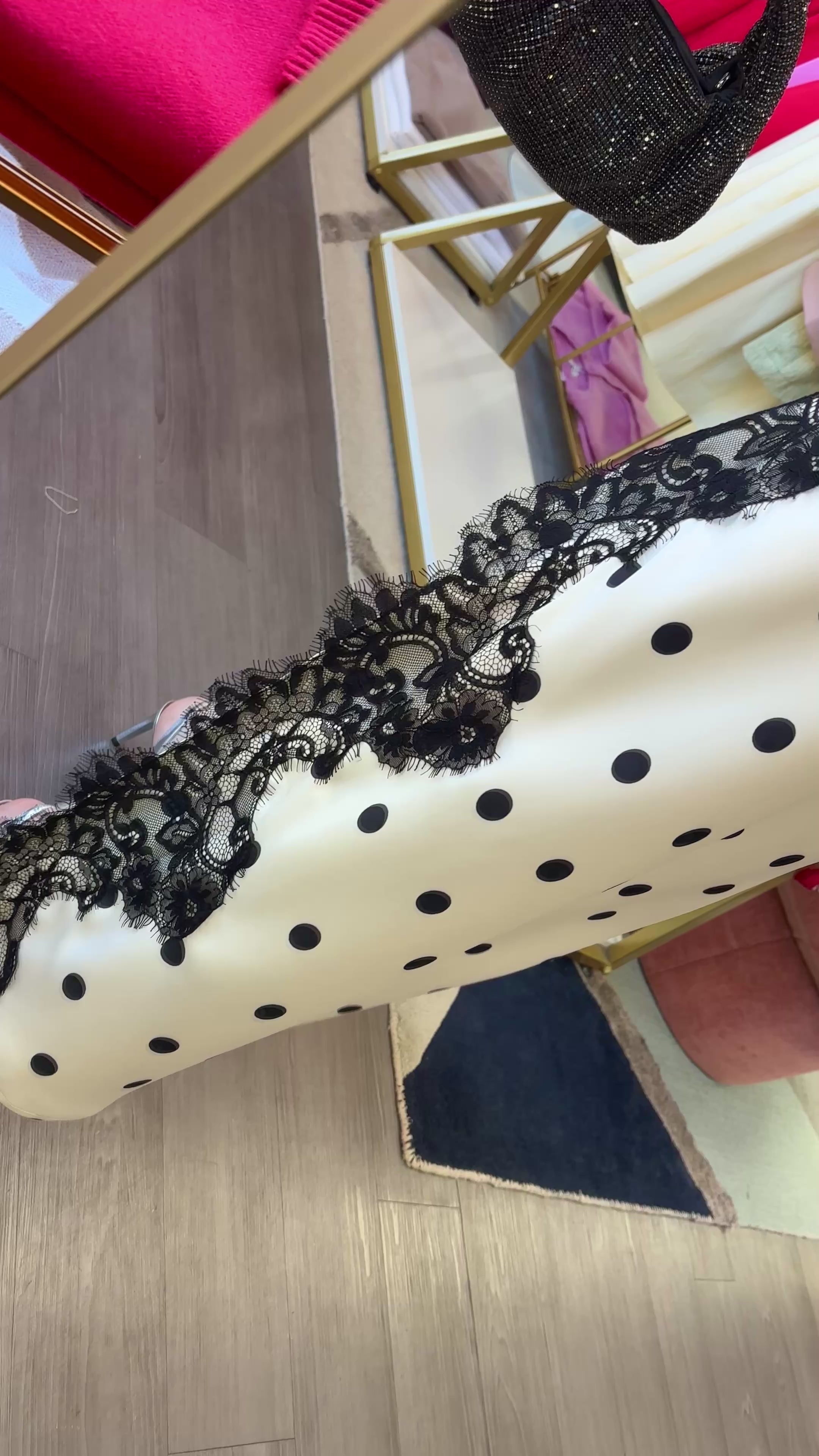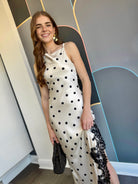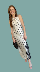 The Karlee Maxi Dress brings effortless elegance with its polka dot design and romantic shoulder ties that drape gracefully down the back. This slip dress features a flattering bias cut and delicate lace slit for movement and style. Alternating black and cream floral accents add visual interest and versatility, making it perfect for everything from casual outings to special occasions. The draped tie shoulders offer a playful touch while maintaining a sophisticated silhouette.