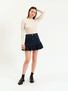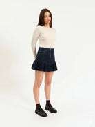The Smooch Skirt in Moonlight Rinse is a denim ruffle skirt in a romantic dark wash. Clean lines flare out into feminine ruffles to create an elevated silhouette.