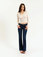 The Heartbreaker is a mid-rise flare in a classic indigo dark wash. This flattering silhouette will take you from daytime to date night with ease.o