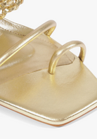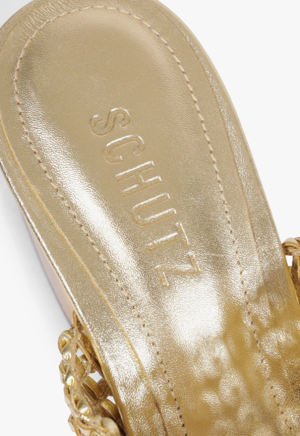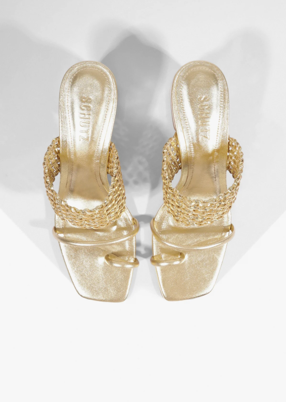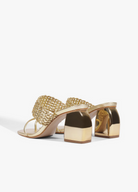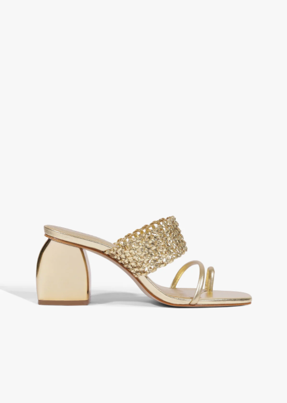 The Aberdeen stands out for its gold woven leather upper and a defined toe-entry detail that shapes the front of the silhouette. This detail gives the sandal a more structured feel before opening into the textured weave above. Set on a golden mid-block heel, the Aberdeen balances craft with clean lines, making it the perfect pair for soft neutrals or elevated casual looks for brunch days with the girls and more.