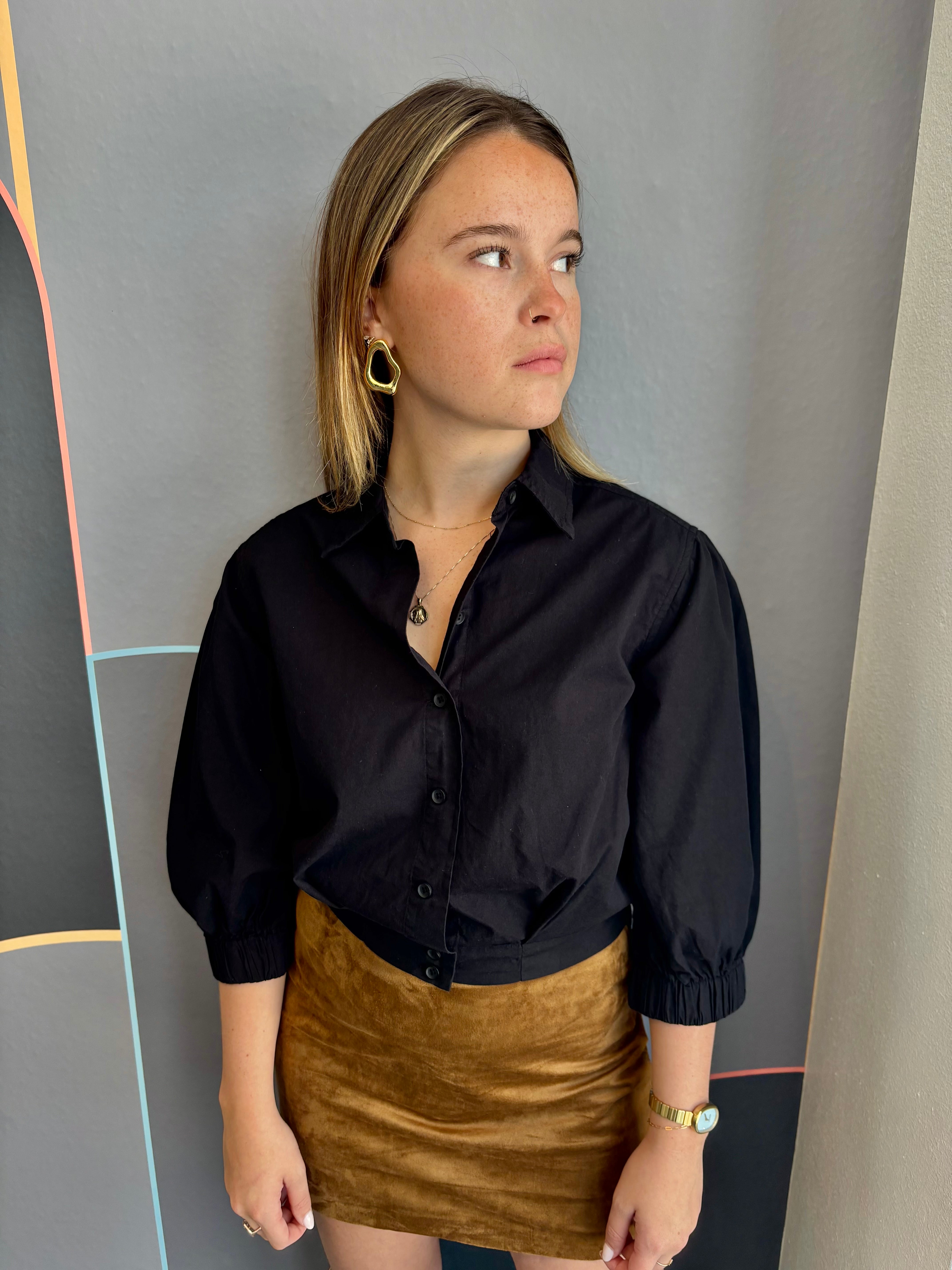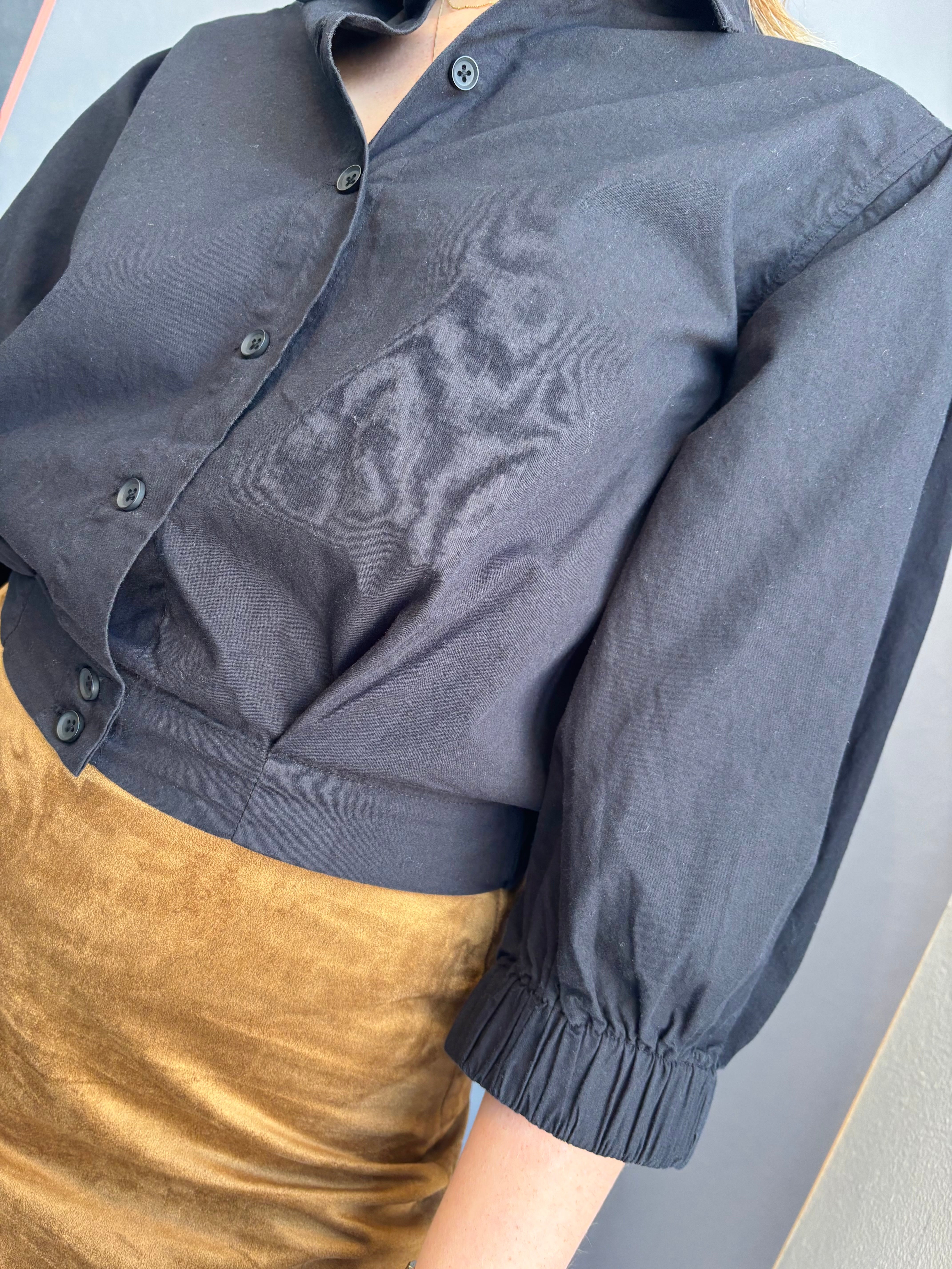 This black cropped top features charming puff sleeves and a button-front design, blending casual style with a trendy silhouette. Its flattering cut pairs effortlessly with high-waisted jeans or skirts, making it a versatile addition for everyday wear. Enjoy a comfortable, breezy fit that elevates your casual outfits with a subtle touch of elegance.
