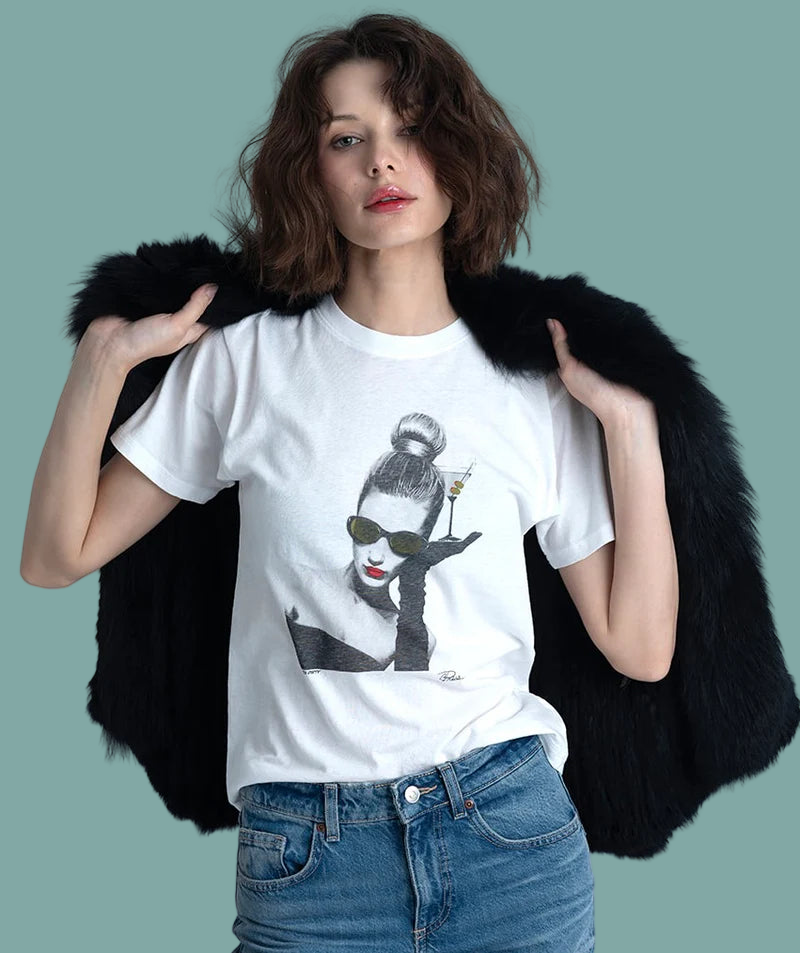We'd like to introduce you to our Mushie Tee! The name says it all. Constructed from our softest cotton and washed so it feels like it's been in your closet forever. Slightly boxy but also the perfect length to tuck into your jeans. My husband and I call each other Mushie, we love to stay in and watch TV and we love to go out on a date night, just like your new tee.….. I think it's the perfect wearable canvas for my art.