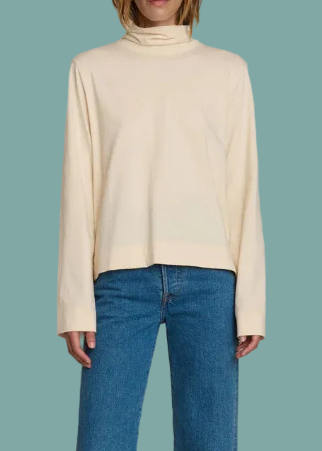 The Neo Mock Neck T-Shirt brings effortless style to your everyday rotation. Crafted from 100% pima cotton, this lightweight knit features a relaxed fit with a mock neck, bell sleeves, and subtle side slits that work whether you're dressing up or down. The easy, roomier silhouette moves with you without feeling oversized, while the fabric's natural stretch keeps you comfortable all day. Available in a versatile Parchment shade that pairs with everything. Machine washable and designed to maintain its softness with gentle care.