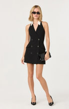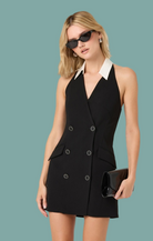 The Perah Dress brings tuxedo-inspired style to your everyday wardrobe. This sleek black mini features a crisp white collared halter neck and sharp front buttons that give it sophisticated edge. Practical pockets keep things functional while the tailored silhouette and streamlined cut deliver modern polish. Dress it up for a night out or keep it casual—this versatile piece works either way.