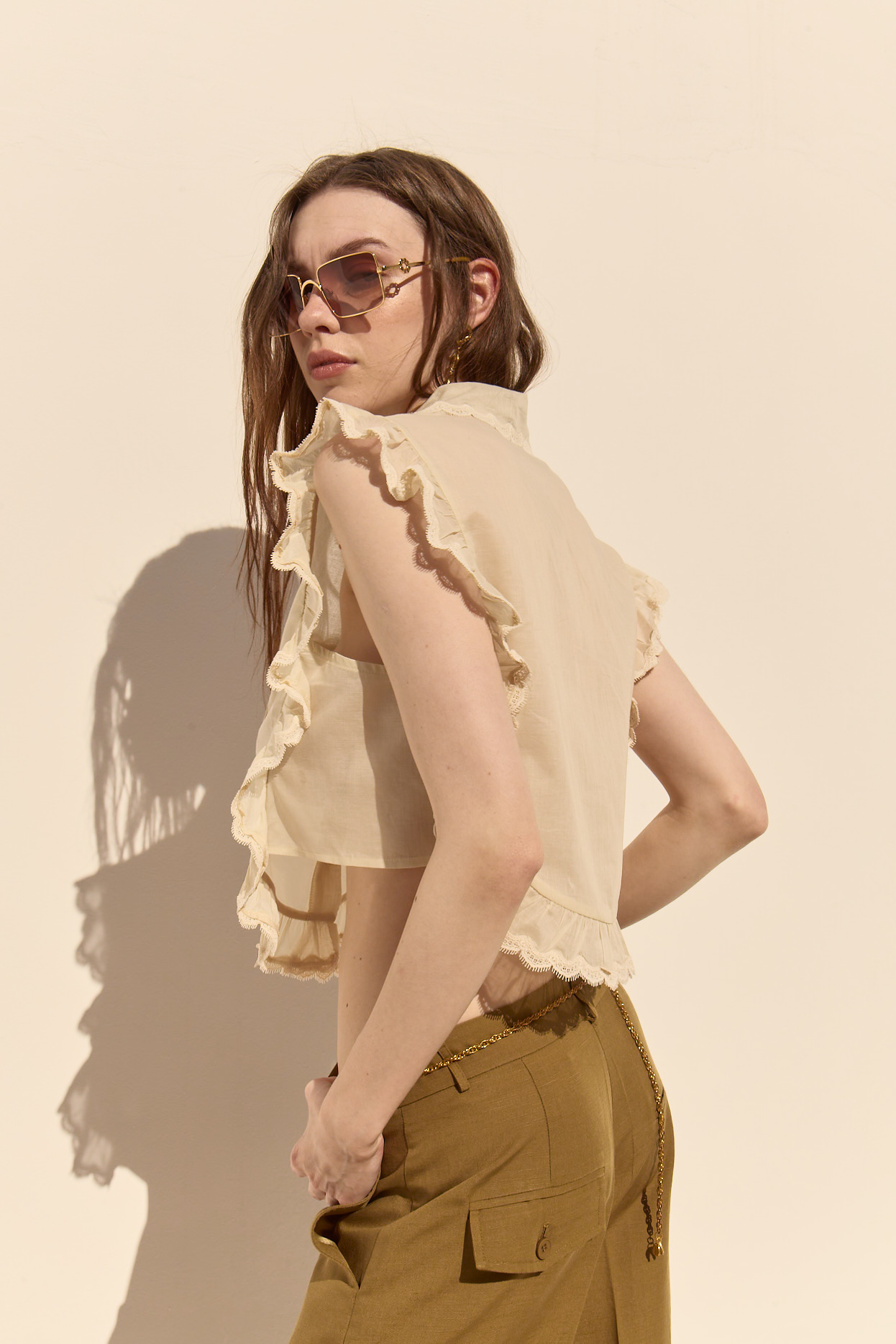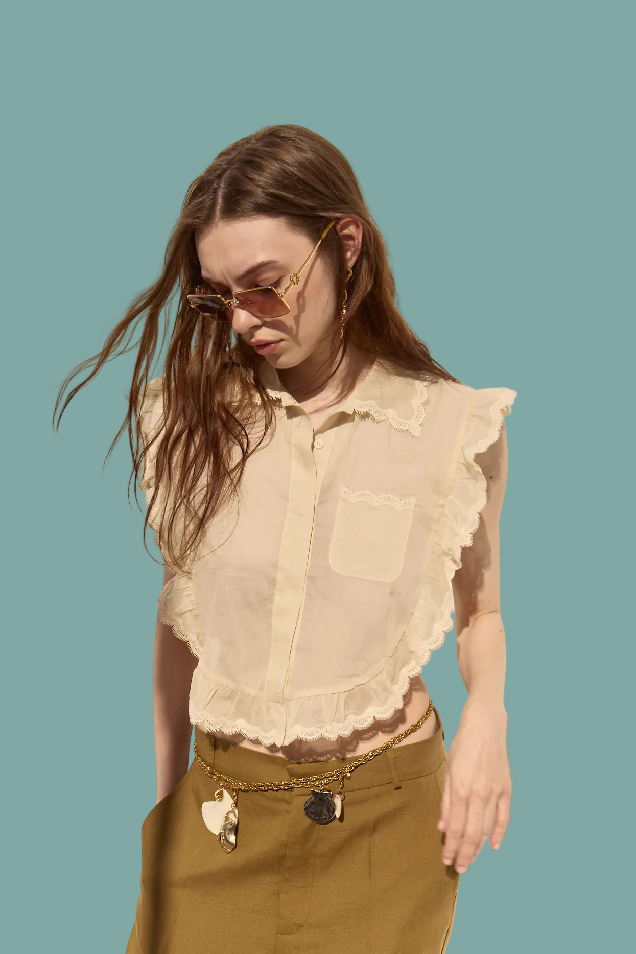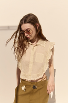 Effortless elegance meets everyday comfort in this sleeveless collared blouse. Crafted from 100% cotton, it's breathable and soft against your skin—perfect for warm weather styling. The delicate lace trim along the rounded hem adds a touch of feminine detail, while the classic collar keeps things polished. Layer it over a tee, tuck it in, or wear it solo for a versatile piece that transitions seamlessly from casual to put-together.