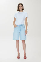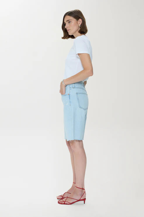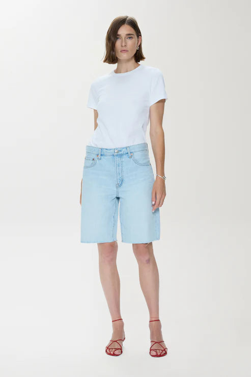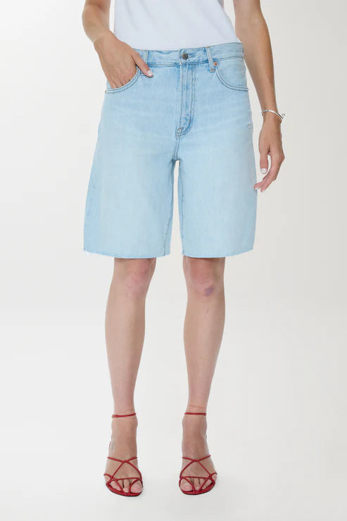 Nolan brings a modern perspective to the classic cut-off short with its relaxed fit and elongated length. The straight shape sits comfortably at the waist, ending in a raw hem. Crafted from non-stretch denim, the Postcard Vintage wash styles seamlessly with warm-weather essentials.