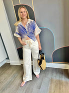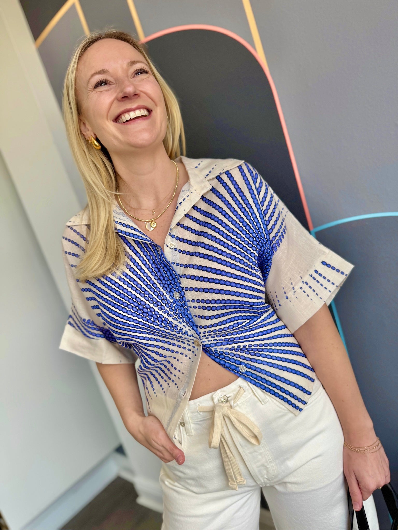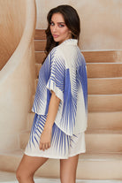 Milio Milano's beloved Sunburst print makes a vibrant comeback this season. This lightweight linen button-down features a crisp collared neckline, convenient button-front closure, and breezy short sleeves in a flattering cropped silhouette. Perfect for warm weather styling, wear it solo or pair with the matching Sunburst Linen Pocket Shorts for an effortless coordinated look. Layer over a tank or style with your go-to denim for endless versatility.