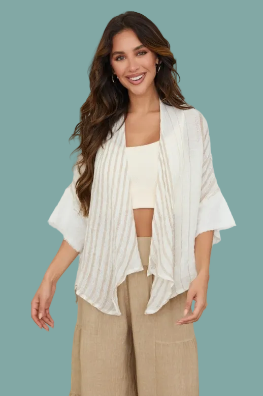 Effortless layering meets timeless style with this striped fishnet knit cardigan. Crafted in a soft cream and beige palette, the open front design lets you wear it loose and relaxed over your favorite tees or dresses. The delicate knit texture adds visual interest while keeping things breathable and comfortable. Perfect for transitional seasons or as a lightweight layer year-round.