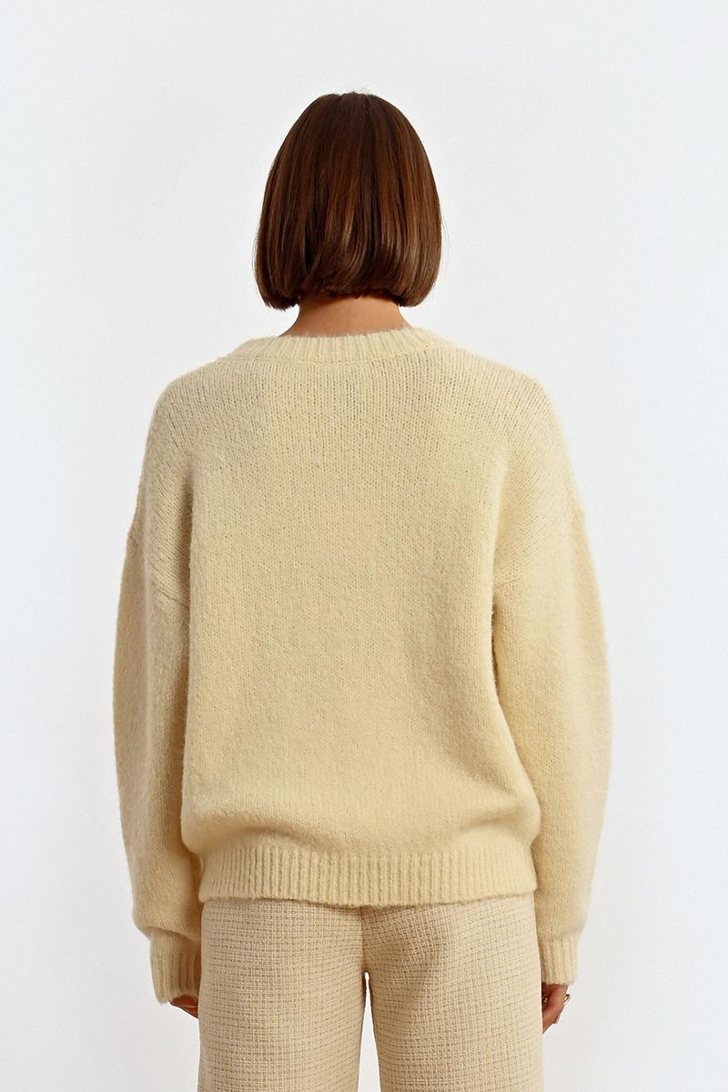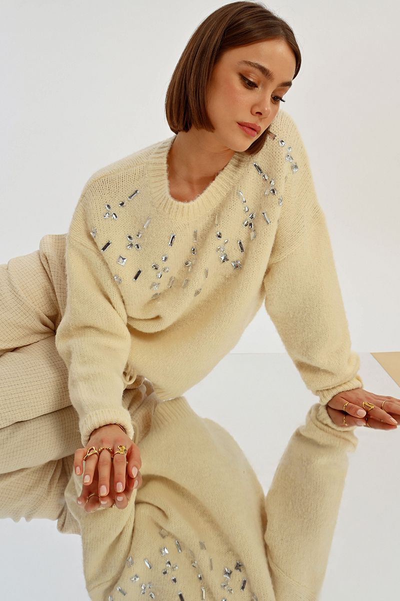 Indulge in luxurious comfort with our Remi Sweater. This bejeweled cream sweater is adorned with silver gems, adding a touch of elegance to any outfit. Stay cozy and stylish all season long.