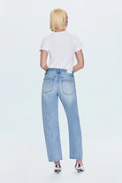 The best-selling jean that understands proportions. Lexi sits at the perfect mid-rise with our signature bowed straight leg, and a subtle curve at the knee that creates dimension without effort. Finished with a 29" inseam, the silhouette tapers to a cropped ankle with a clean hem. Crafted from our rigid denim in Aries, a light blue wash adorned with subtle stud details that feel refined and intentional, never overdone. Your must-have statement jean for making an impact with sophisticated appeal.