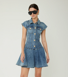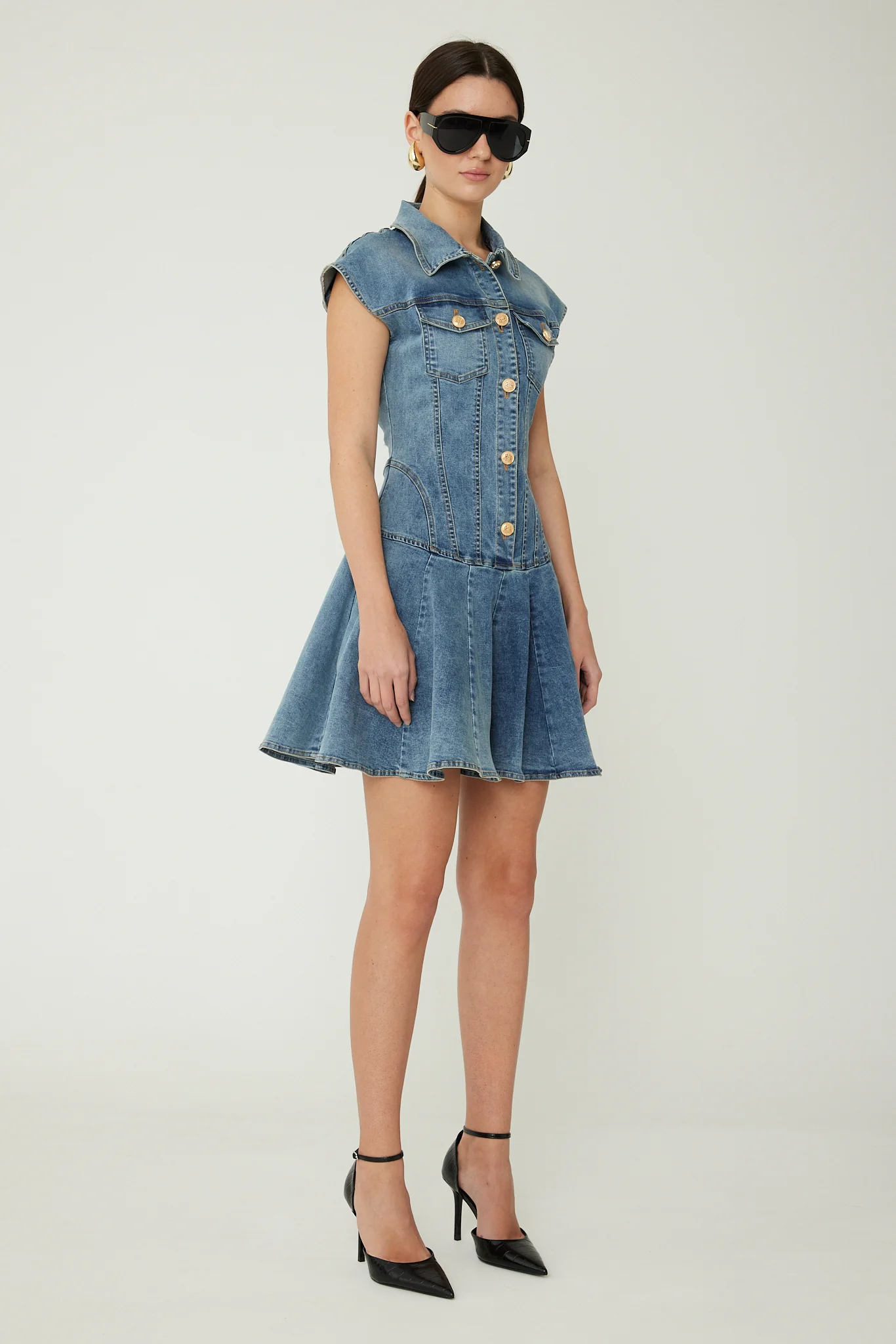 Crafted from JS71's stretch denim in a medium wash, the Tina dress features elegant gold hardware accents. Its fit-and-flare silhouette enhances your shape beautifully. Versatile in style, it transitions effortlessly from casual to refined with just a change of footwear.