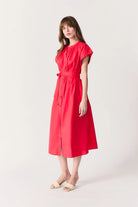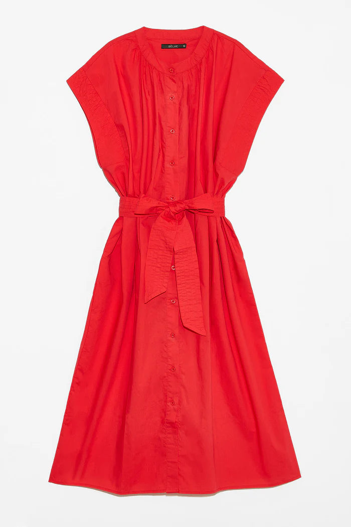 Poplin sleeveless shirt dress with mandarin collar. Self tie belt and pockets at side seam. Front button closure