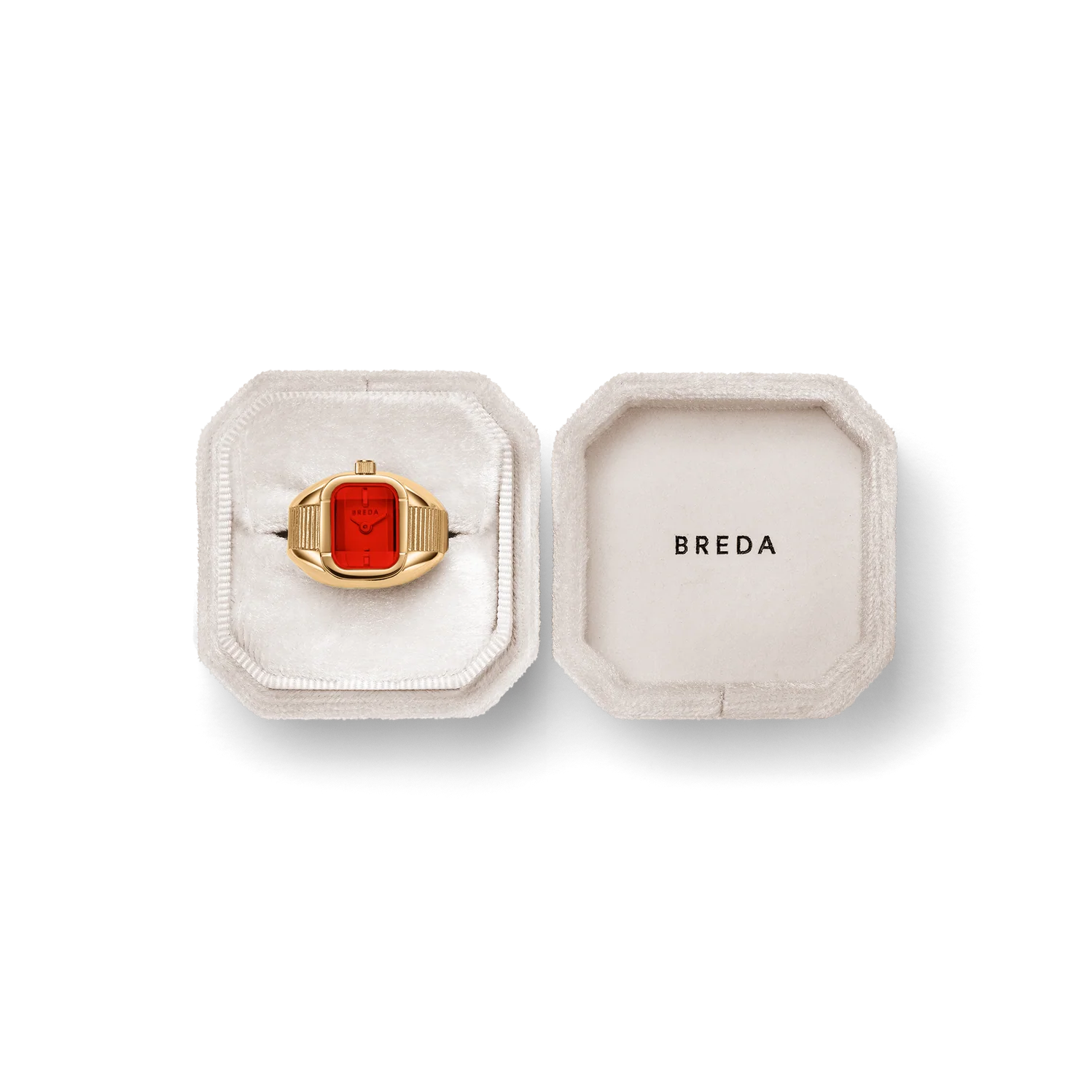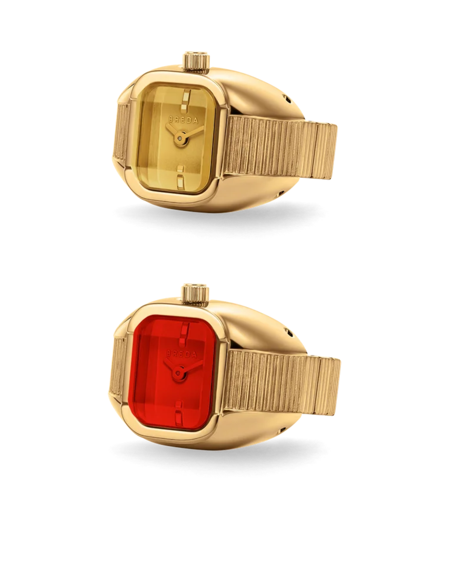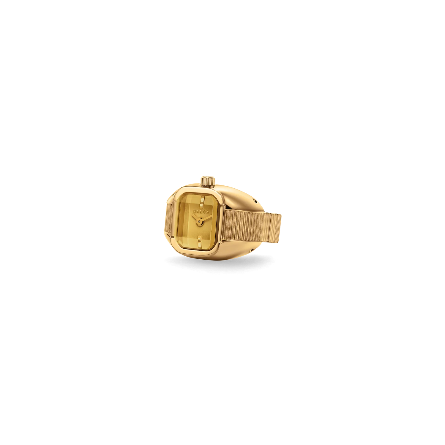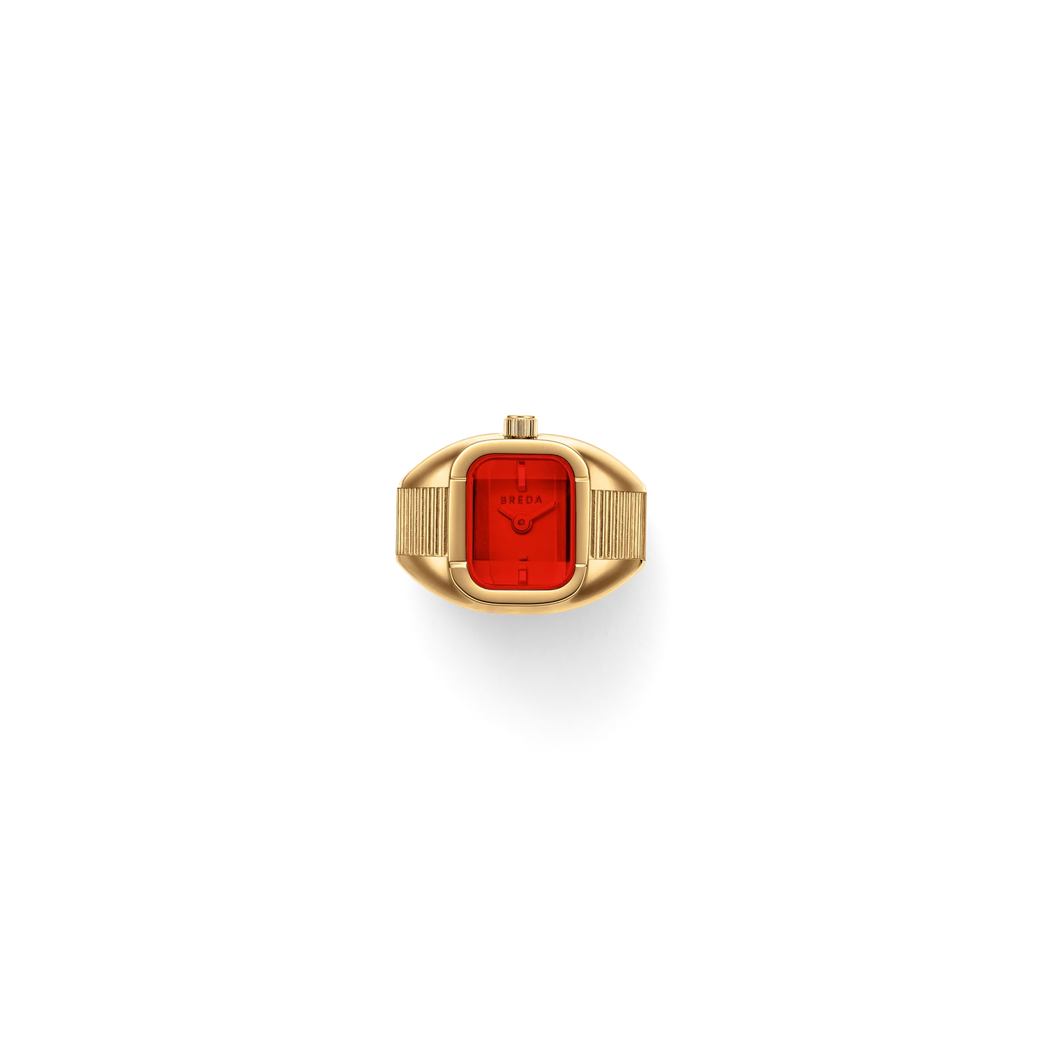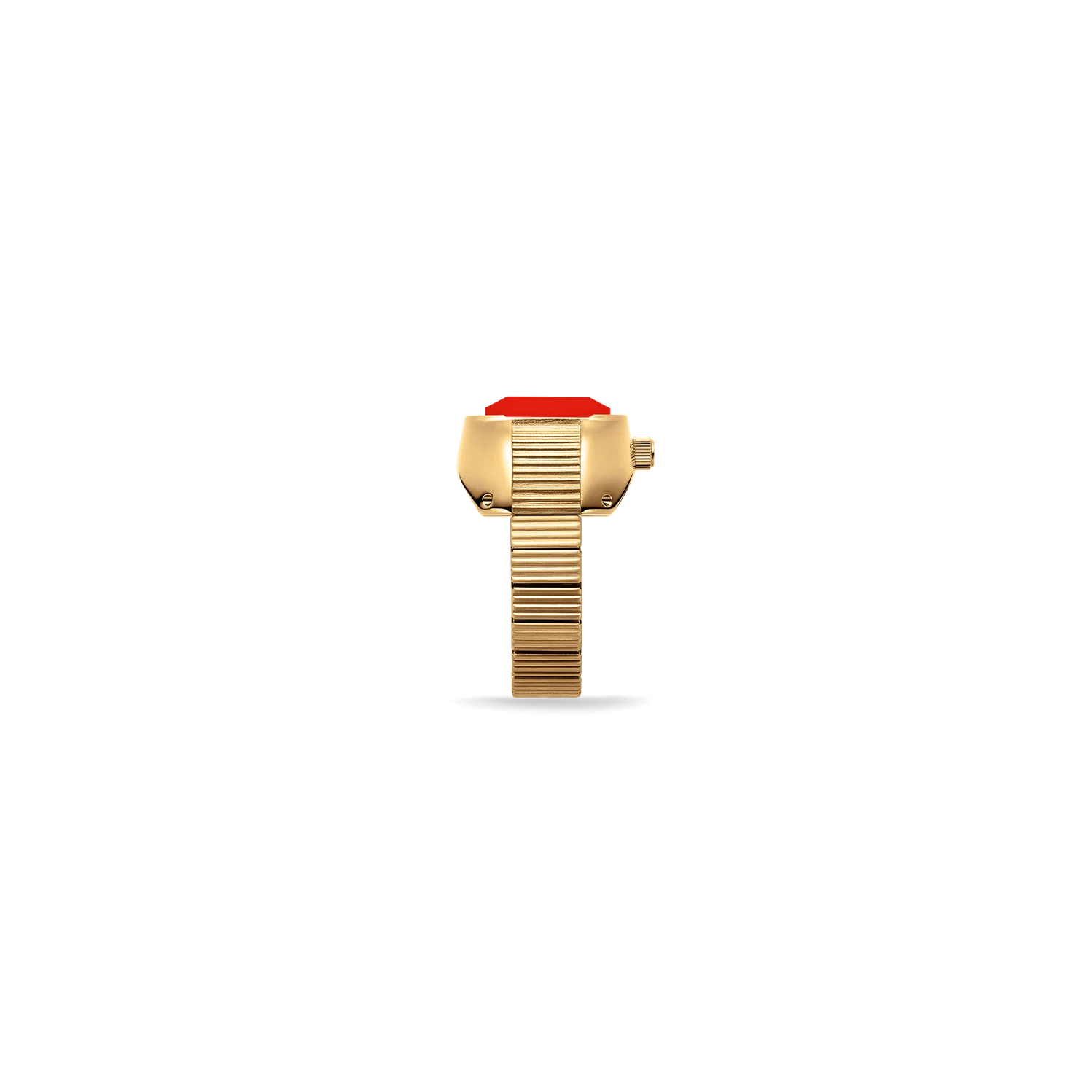 Inspired by the magic of nighttime, the Nocturne Time Ring captures nocturnal elegance on your wrist. This striking timepiece features an 18K deep gold-plated stainless steel case with soft edges and a distinctive 16mm rectangular design. The flame-colored crystal creates a mesmerizing contrast against the polished gold ridges that frame the dial, while the expandable band ensures a comfortable fit for any occasion. Perfect for those who appreciate bold, sophisticated style with a touch of mystery.