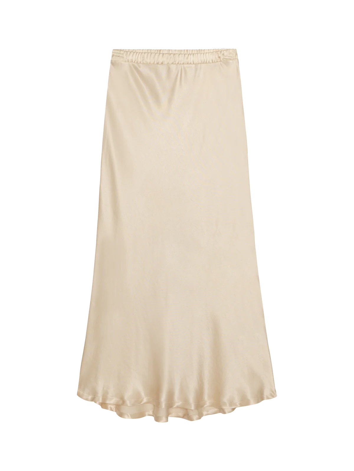 The Mabel Bia Skirt delivers effortless elegance with its bias-cut design that creates a flattering, streamlined silhouette. Crafted in luxurious Hammered Satin, this midi-length piece features a raw hem for an on-trend, relaxed vibe and an elastic waist for all-day comfort. Available in a soft Moonbeam shade that pairs with everything in your wardrobe.