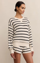 Crafted from buttery-soft modal fleece, this relaxed crewneck sweatshirt features easy stripes, subtle dropped shoulders, and a stylish triangle neck yoke. Casual yet refined, it’s a cozy standout.