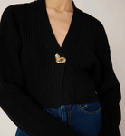 Crafted from soft organic cotton yarn, the Heart Sweater brings a touch of playful romance to your wardrobe. Designed with heart-shaped button closures, a flattering cropped silhouette, and ribbed detailing at the neckline, hem, and cuffs for a polished fit. The statement imperfect heart charm adds a unique, one-of-a-kind touch. A versatile, layerable style that pairs easily with denim, skirts, or layered over dresses and under jackets.
