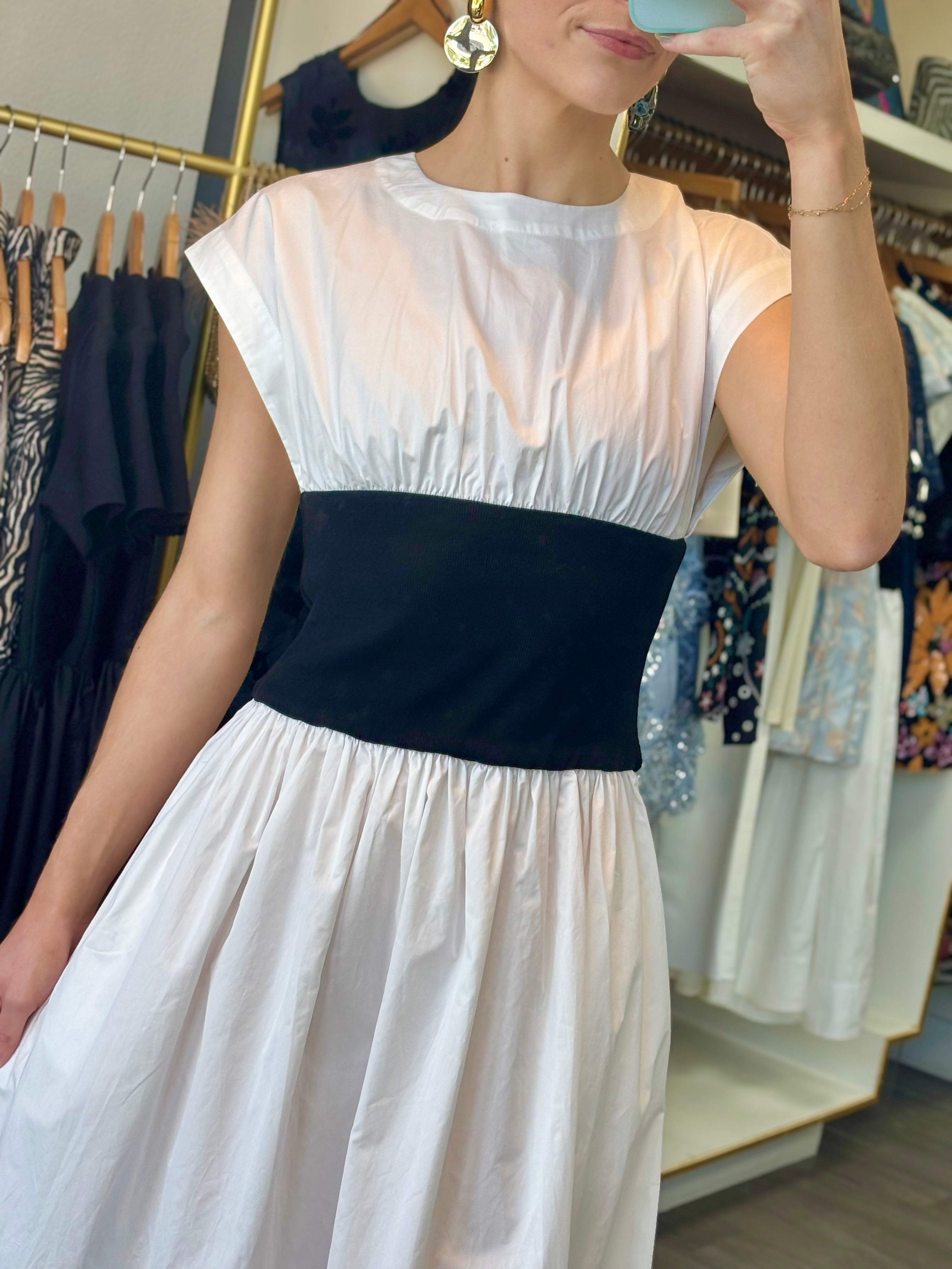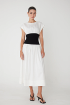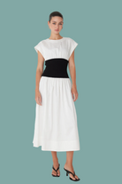 The Alix dress brings together timeless style and smart design. Crafted from crisp white cotton poplin, it offers a clean, polished look that works for countless occasions. The standout feature? A structured black ribbed waistband that adds definition and creates a flattering silhouette. This simple color contrast delivers understated sophistication while giving you that effortless, put-together feel. Whether you're heading to brunch, the office, or an evening out, the Alix is your go-to piece for looking refined without trying too hard.