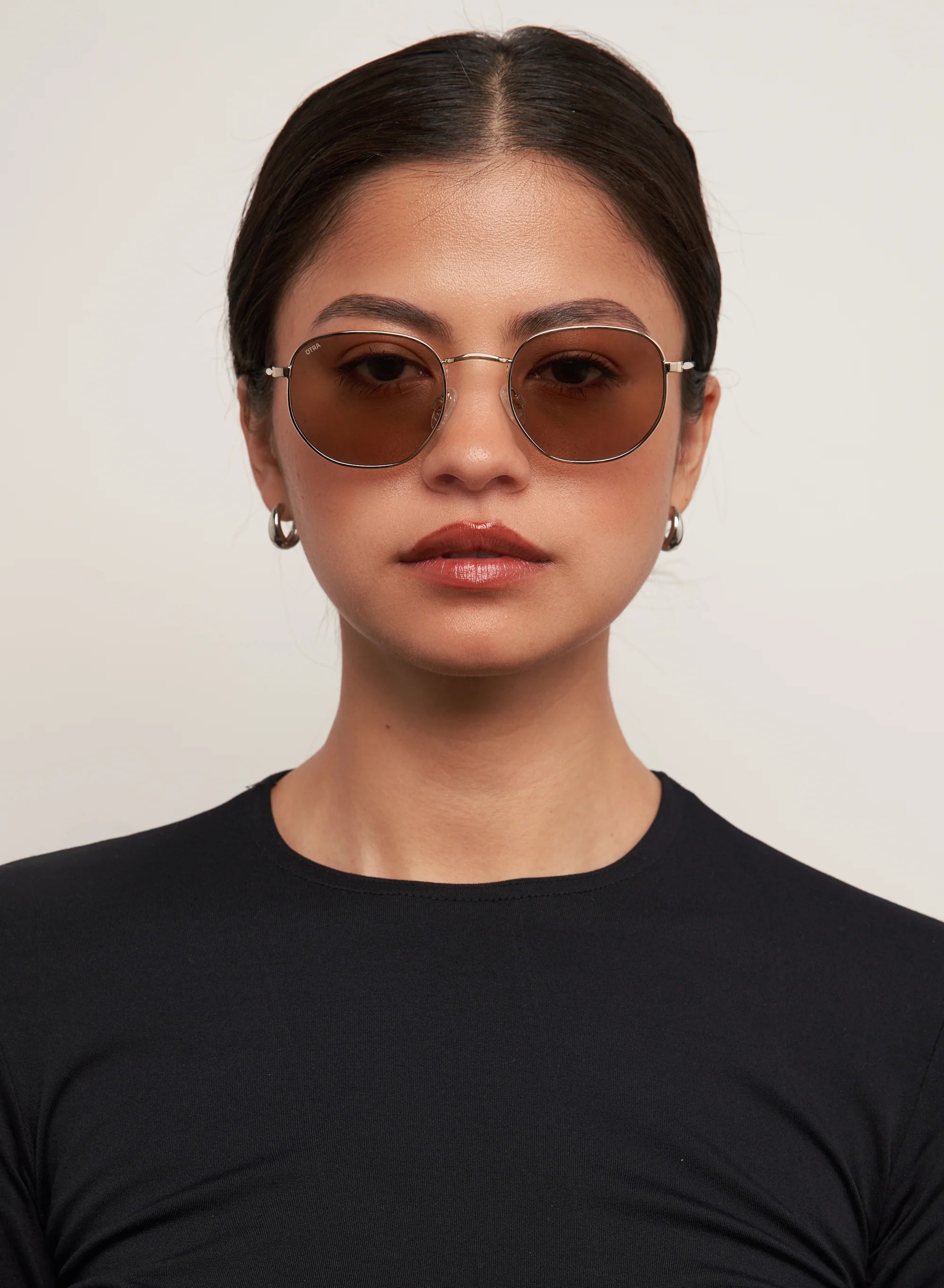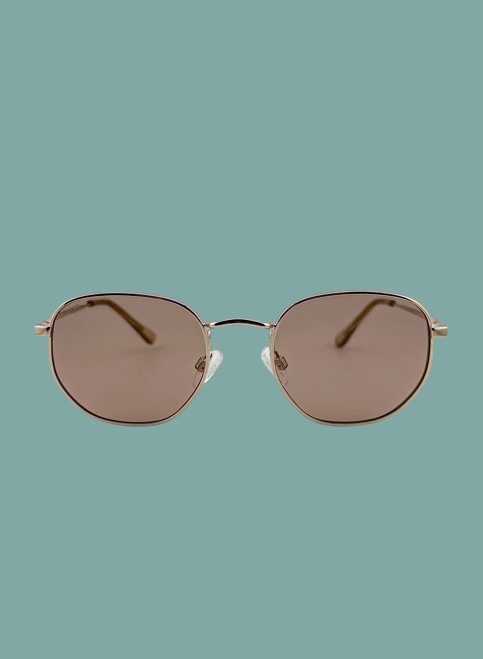 Bowie Sunnies feature a sleek hexagonal gold metal frame that perfectly combines vintage vibes with a modern twist. The warm brown lenses add a touch of timeless style while keeping your look fresh and effortless. These sunglasses are your go-to accessory for adding subtle sophistication to any casual outfit.