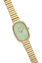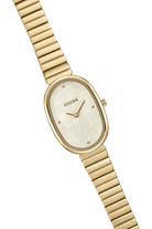 Inspired by sun-soaked days by the water and luxurious evenings, the Jane Watch embodies effortless elegance. This timepiece features a delicate 23mm oval case paired with a champagne-colored mother of pearl dial that catches the light beautifully. The gold-plated stainless steel bracelet fastens with a refined jewelry clasp, making it as much a statement piece as it is functional. A timeless classic that transitions seamlessly from day to night. Note: Mother of pearl is naturally unique—each dial features its own distinct texture variations, making your Jane truly one-of-a-kind.