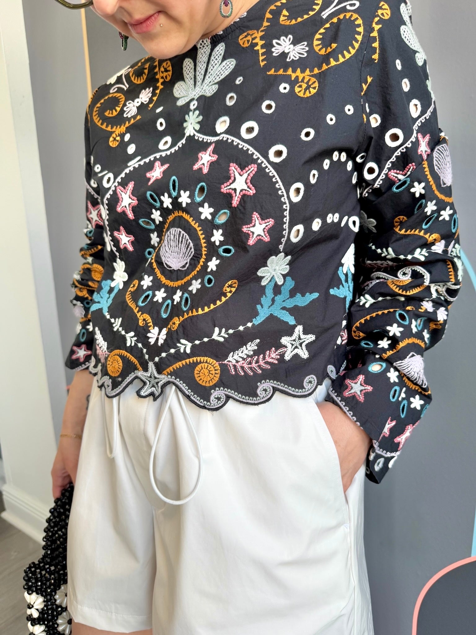 Introducing our stylish Leela Top, made of 100% cotton with delicate embroidered floral detail and a charming scalloped hem. Perfect for a casual day out, this top offers comfort and subtle elegance.