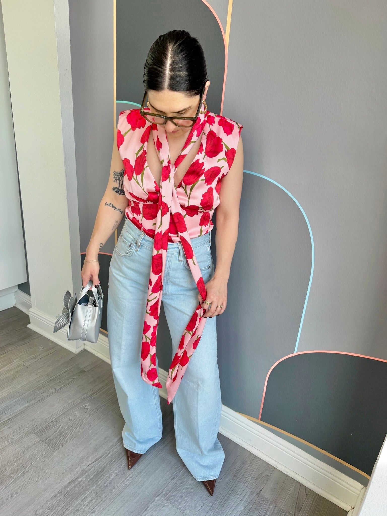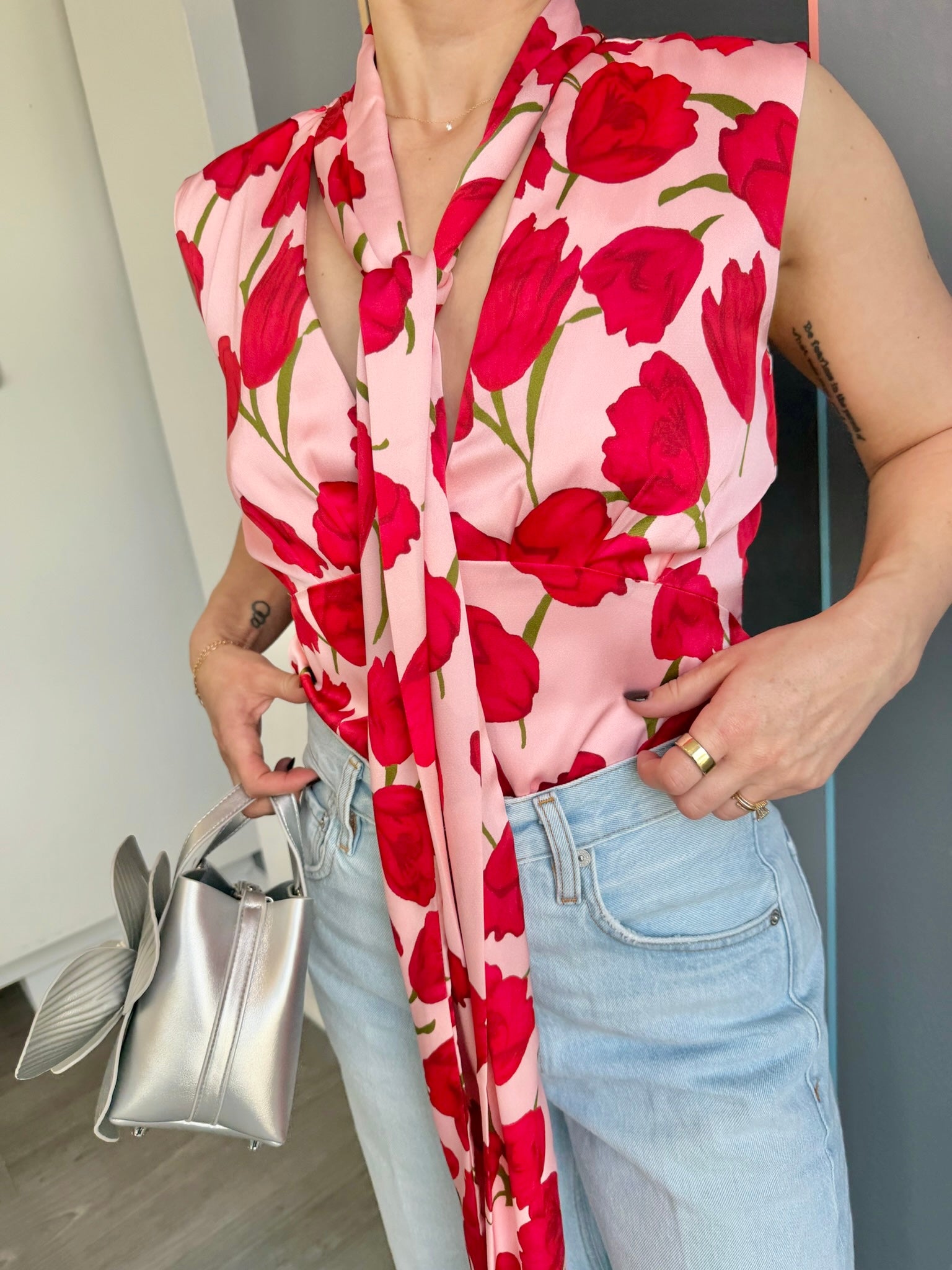 The Melia Top features a flattering v-neckline with a decorative neck tie detail that adds instant polish to any outfit. Crafted from printed satin, this fully lined piece drapes beautifully while maintaining its shape. The slim fit silhouette creates a streamlined look, and the non-stretch fabric ensures a structured, put-together appearance all day long. Perfect for elevating your everyday style with effortless sophistication.