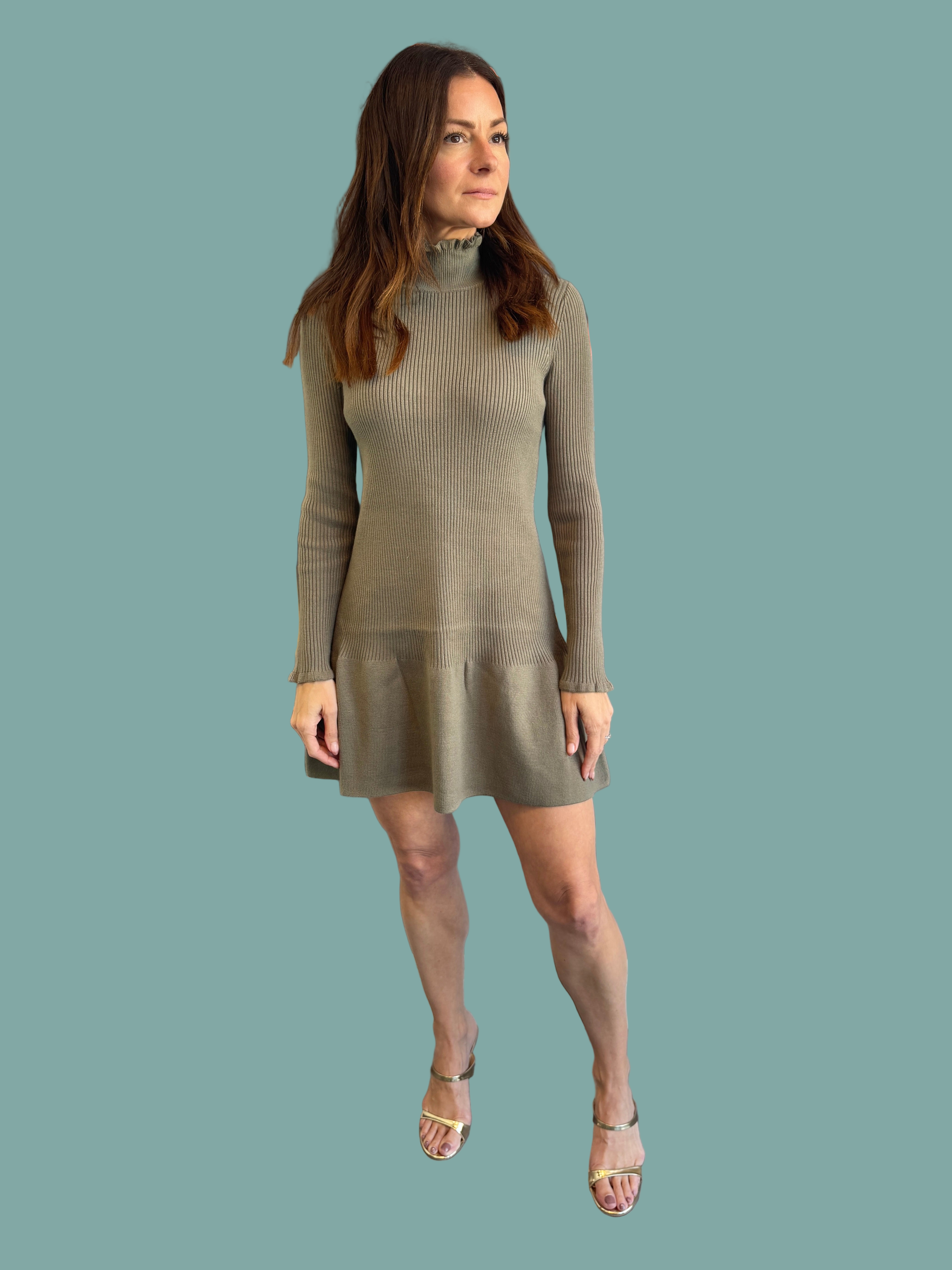 The Nikita Dress features a ruffled neck and flouncy ruffle hem for a playful touch. Made from ribbed material with long sleeves, it keeps you comfortable and stylish. Available in crème and olive green, this versatile dress pairs perfectly with sneakers for a laid-back vibe, boots or heels to elevate your look, or ballet flats for an adorable finish.