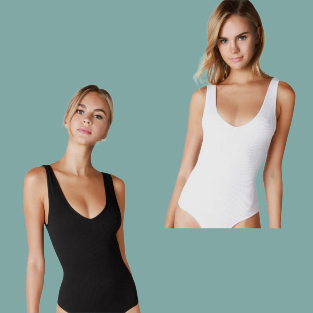 Seamless ribbed knit bodysuit with V-neckline and wide straps..