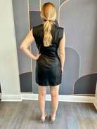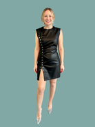 The Robin Dress is a chic vegan leather mini dress designed for effortless style. Featuring side ruffle button details, it adds a playful touch while maintaining a sleek silhouette. Perfect for casual outings, this dress combines comfort with modern edge, making it an ideal choice for your wardrobe.
