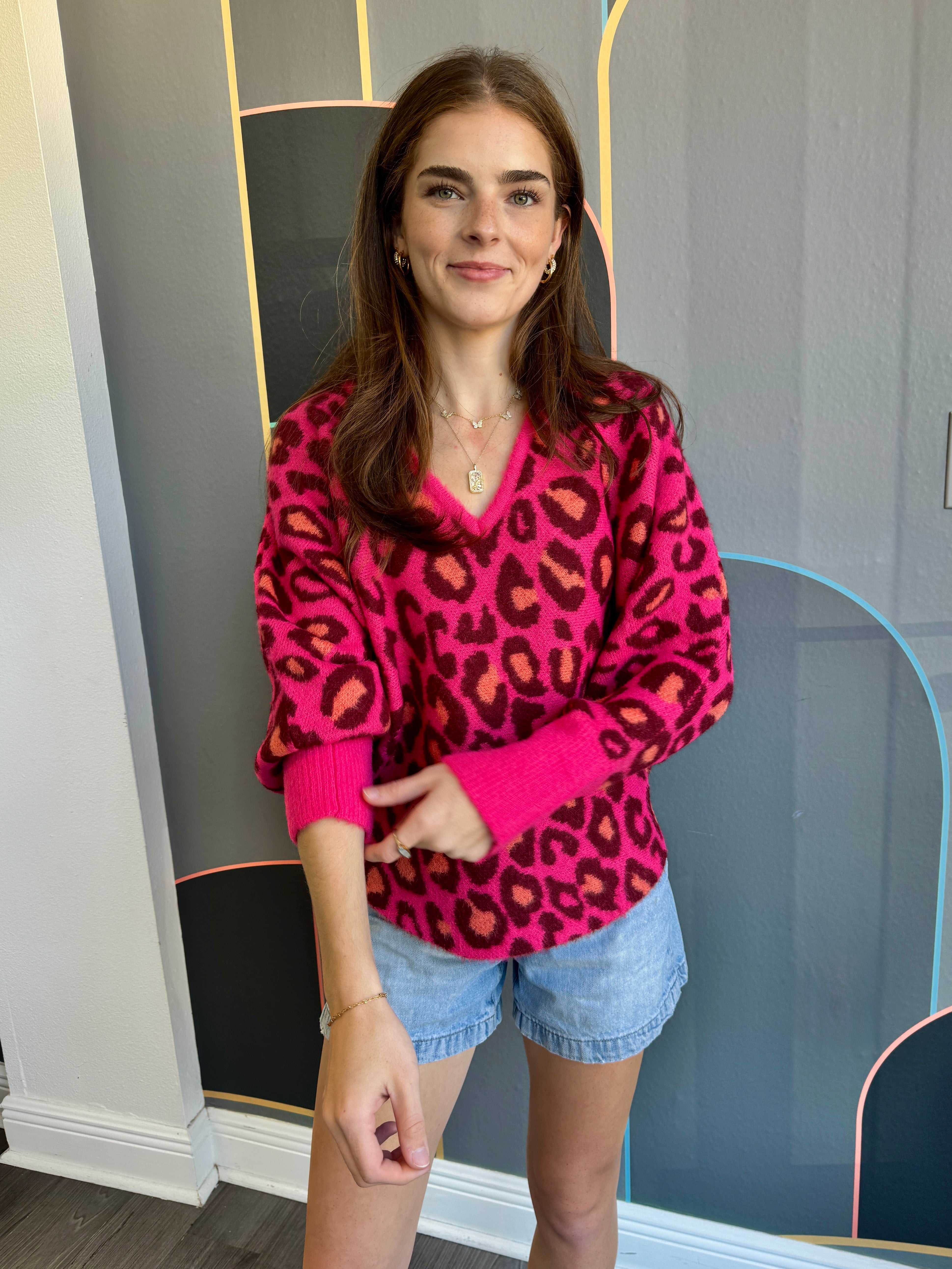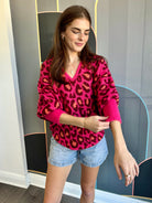 Stay cozy and stylish with the Ryu "FuzzFuss" Top. This ultra-soft sweater features a bold hot pink base highlighted by striking red and burgundy leopard spots, adding a playful edge to your fall or winter looks. Its relaxed fit and flattering V-neckline offer comfort without sacrificing style, while ribbed cuffs and hem provide a polished finish.