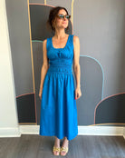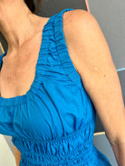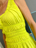 Look effortlessly chic in the Saint James Dress. With its scoop neck and ruched torso, this blue or lime midi dress accentuates your curves in all the right places. The tight bodice and flared waist and hips create a flattering silhouette. Perfect for any occasion, this dress is a must-have for your wardrobe.
