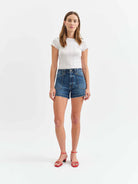 A relaxed, yet polished denim short with stitch front pockets, a high rise waist, and a true indigo wash. Constructed in our "Tough Love" denim, it's mostly rigid but yields to your body in all the right ways.