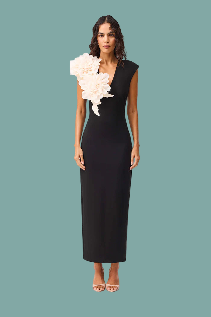 The Zahara Gown in Black combines sleek tailoring with a bold, feminine touch. Its slim fit and soft stretch fabric offer comfort and a flattering shape, while the deep V-neck adds a daring edge. The unique flower trim gives it a stylish, textured look, and the invisible zipper ensures a smooth finish. Perfect for formal events or nights out, this gown delivers a polished yet modern vibe with ease.